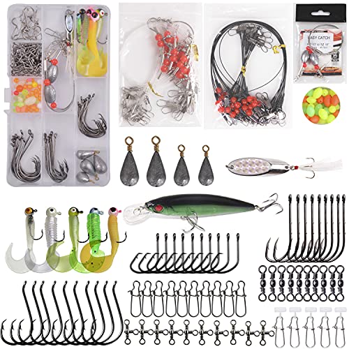 This fishing kit contains 138 pieces, including 1 Minnow Lure, 1 Spoon Lure, 5 Saltwater Jigs, 4 Sinkers Weights, 24 Wire Leaders, 2 egg sinker weight rigs, 10 Circle Hooks, 10 J Hooks, 10 Wide Gap Hooks, 5 Sinker Sliders, 36 Beads, 10 Barrel Swivels, 10 Three Way Swivels, and 10 Dualock Snaps.