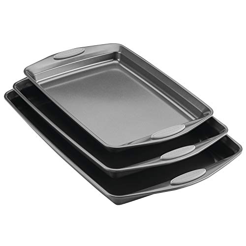 This baking set includes three different sized cookie pans: 9-Inch x 13-Inch, 10-Inch x 15-Inch, and 11-Inch x 17-Inch. Each pan is made from durable steel that resists warping, ensuring that they will last for years to come. The long-lasting nonstick coating on these pans provides excellent food release and makes cleanup a breeze.