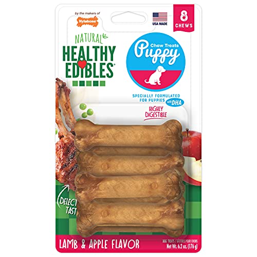 Nylabone Healthy Edibles are ideal for small puppies as a long-lasting, all-natural chew treat made with lamb and apple flavors.