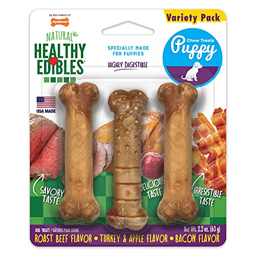 This puppy starter kit includes three delicious flavors: bacon, roast beef, and turkey & sweet potato. Each petite-size chew treat is perfect for small mouths and will keep your puppy entertained for hours. And with dimensions of 3.81" long x 1.06 " wide x 0.63" high, these treats are the perfect size for your little one.