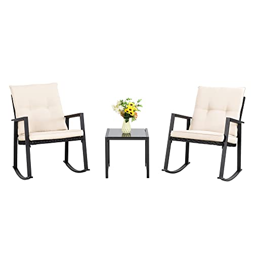 The Homall patio furniture set comes in a variety of sizes. The single chair measures 18.1 inches in length, 18.1 inches in width, and 34.1 inches in height. The double chair measures 35 inches in length, 20.7 inches in width, and 33.3 inches in height. The table measures 28.1 inches in length, 16.1 inches in width, and 15.4 inches in height. With a weight capacity of 330 pounds, this set can accommodate most people.