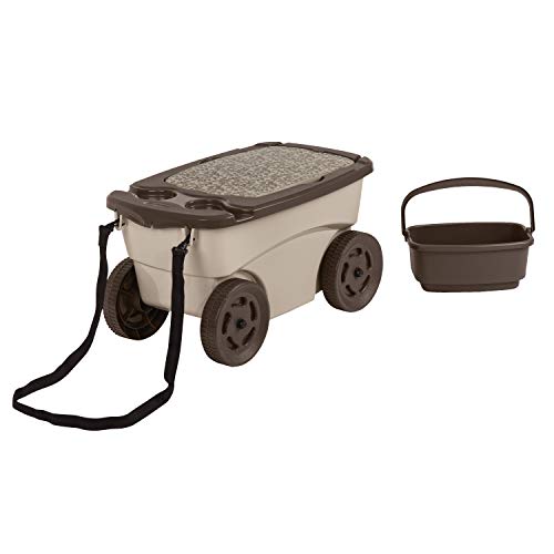 Ideal for gardening tasks such as weeding, planting, and storing tools with a rolling storage bin, bench seat, and interior tool tray.