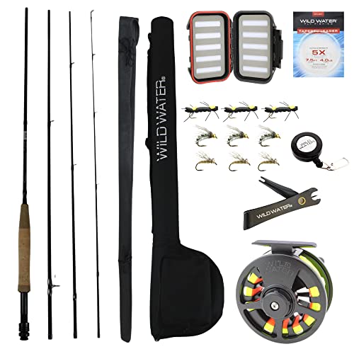 The Wild Water Fly Fishing Starter Package is the perfect set for novice and experienced anglers alike. This well-crafted 9-foot fly fishing rod is made of durable and light IM8 matte black graphite, weighing just 4.4 ounces. It features a high-quality reel seat with double lock rings, stainless steel stripper guide with silicon carbide rings, and a laser-etched butt cap. The rod also comes with a 7-inch long Western-style cork handle that is fitted with compressed cork and rubber trim rings, providing added grip and comfort.