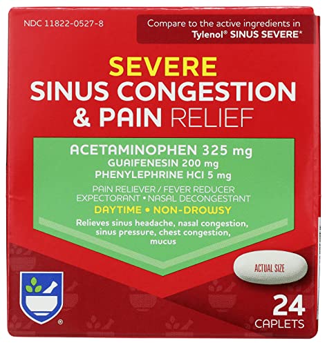 Rite Aid Severe Sinus Congestion & Pain Relief is a reliable cold medicine that helps relieve a wide range of symptoms. Each caplet contains 325mg of Acetaminophen, which provides fast and effective relief from minor aches and pains, headache, sore throat, and fever. Additionally, this powerful medicine also contains an expectorant and nasal decongestant that clears mucus and nasal congestion.
