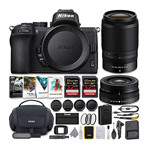 The Nikon Z 50 DX-Format Mirrorless Camera Bundle is the perfect choice for photography enthusiasts who want to capture their memories in stunning detail. This bundle includes the Nikon Z 50 camera, NIKKOR Z DX 16-50mm f/3.5-6.3 VR and NIKKOR Z DX 50-250mm f/4.5-6.3 VR lenses, Nostrand Avenue Camera System Gadget Bag with Accessory and Cleaning Kit, Software Suite v3, 3-Piece 62mm UV/CPL/ND Filter Kit, and Extreme PRO 32GB SD Memory Card.