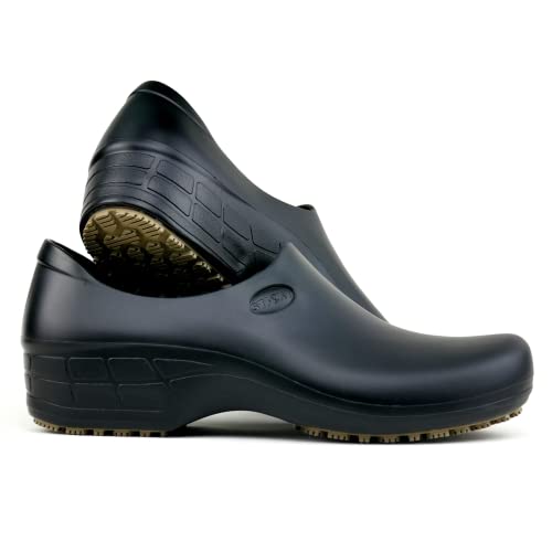 A shoe that is slip-resistant and antimicrobial, suitable for healthcare and food service industries.