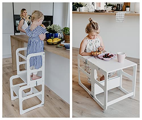 It is ideal for multitasking in the kitchen, aiding children in cooking/weaning activities, and serving as a playtable.