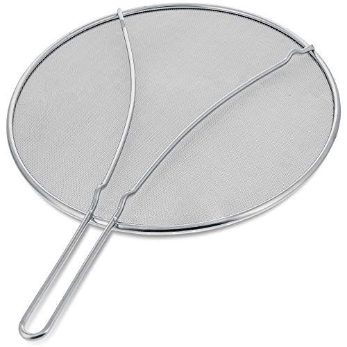 Introducing the Professional Grade 13" Splatter Screen, a must-have for any kitchen! This splatter screen is constructed with high performance stainless steel, ensuring its durability and sturdiness. It's designed with a rust-proof fine wire mesh screen that features a double thick twill weave, making it resistant to denting, capable of catching finer particles, and flat and stable for daily use. Its size makes it suitable for almost any pot or pan.