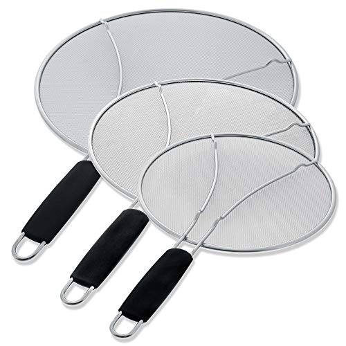 These splatter screens have multiple uses, making them a versatile addition to your kitchen tools. They are perfect for use while simmering food, when needing to see and check on the food, or at times when the food will get too hot while using a pan lid. The screen will contain the splatter and allow the steam to escape, while the pan and food maintain a stable heat level. The screens are also used for draining and straining, and to steam vegetables on placed on top of it while cooking or as a cooling rack for cupcakes and cookies.