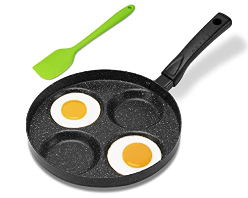 Measuring 9.5 inches in diameter and 1.57 inches in height, each cavity measures 3.7 inches, making it perfect for frying eggs, bacon, pancakes, burgers, and more. Plus, this egg frying pan comes with a matching spatula to help you fry eggs perfectly, without any sticky or wrinkled edges.