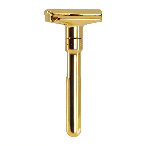 The Merkur Futur adjustable safety razor boasts a sleek and modern design, paired with impressive functionality. This razor is finished in a luxurious 24k gold plating, making it an elegant addition to any shaving kit.