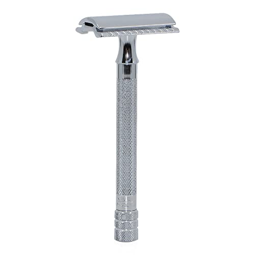 This razor features a double edge safety design, which is very convenient and provides a quick, decent shave. Its heavy weight of 4.2 ounces gives a solid feel in the hand, allowing the razor to do most of the work. This makes it easy to use, even for those who are new to using safety razors.